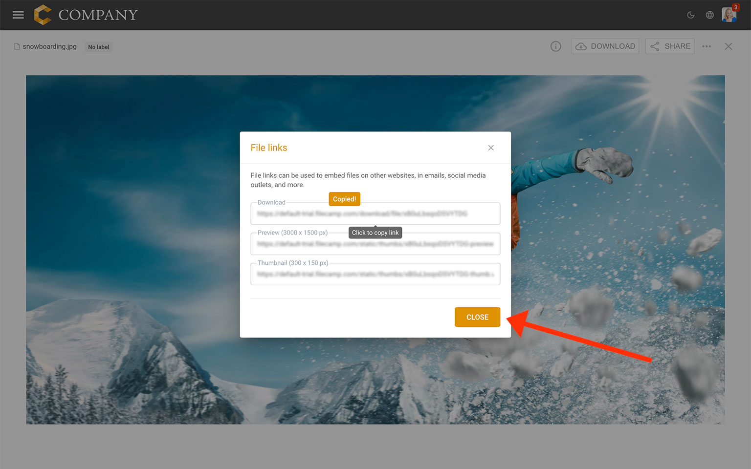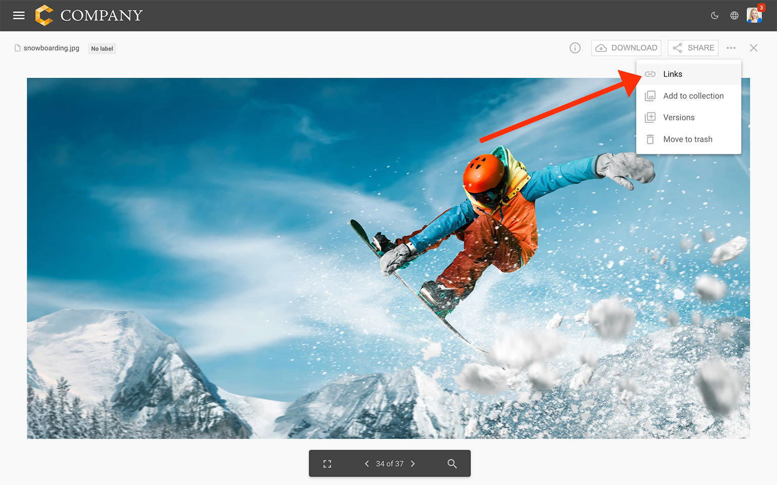 This will open a pop-up window where you can copy the direct links to the file, or to some predefined lower resolution versions (images only). These links can be used to embed the file on other websites, in emails, social media outlets, and more.